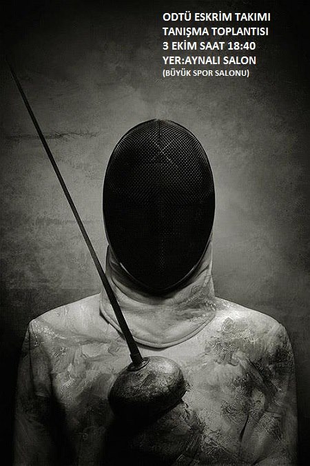 ODTÜ Eskrim Takımı, 2014-2015 sezonu güz dönemi için yeni bir tanışma toplantısı ile sizlerle. Özellikle eskrim nasıl bir spordur öğrenmek, heyecan verici gösteri maçlarını canlı olarak izleyebilmek ve muhteşem bir takımla tanışabilmek için bu salı kimseye söz vermeyin, söz verdiyseniz söz verdiklerinizi de alın getirin.