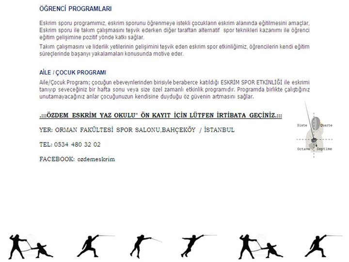 Tüm çocuklarımız eskrim öğrensin diye Ankara’da Eskrimin Merkezi Çankaya Eskrim’den muhteşem bir kampanya. Yaz süresince 3 aylık eskrim kursu sadece 100 lira. Çankaya Eskrim’e ulaşmak ve eskrim hakkında detaylı bilgi almak için hemen arayın 0(533)3152298. Derslerimiz cumartesi saat 11:00-12:30 veya pazar saat 17:00-18:30 arasındadır. Kayıt için hemen aşağıda bulunan iletişim formumuzu kullanabilirsiniz.